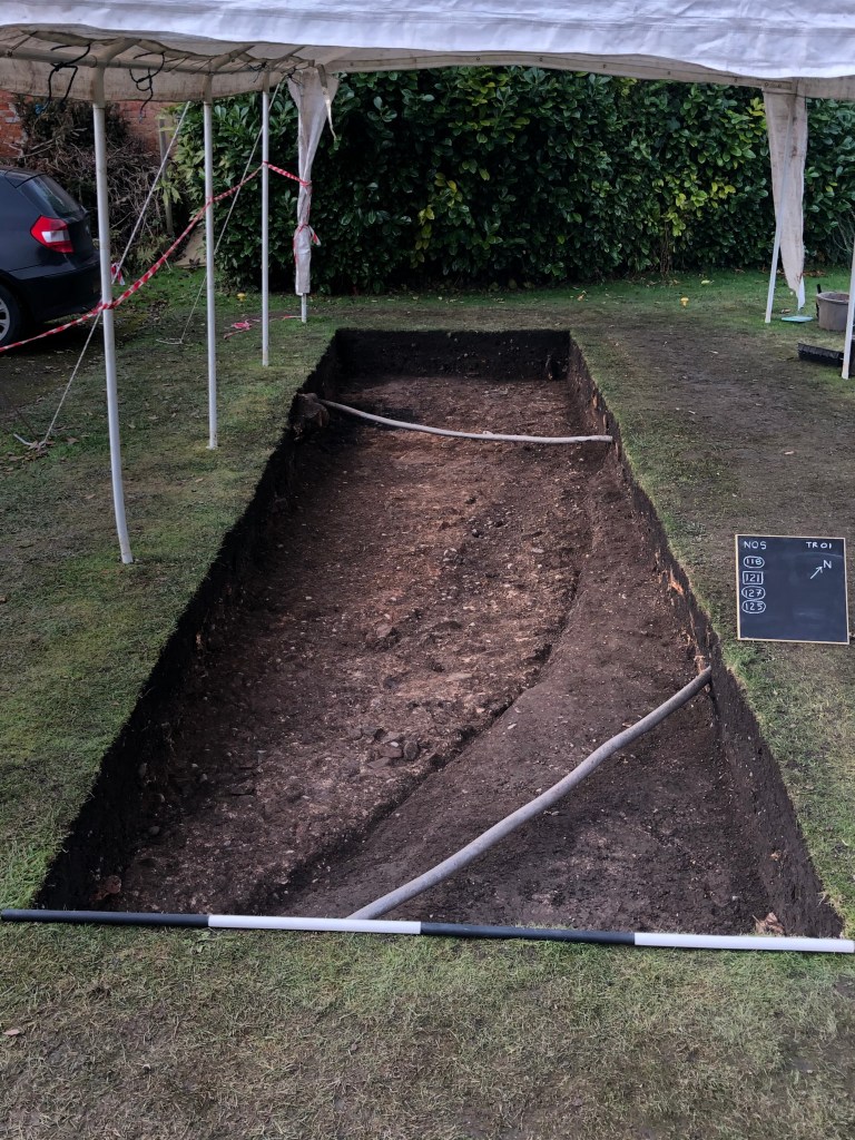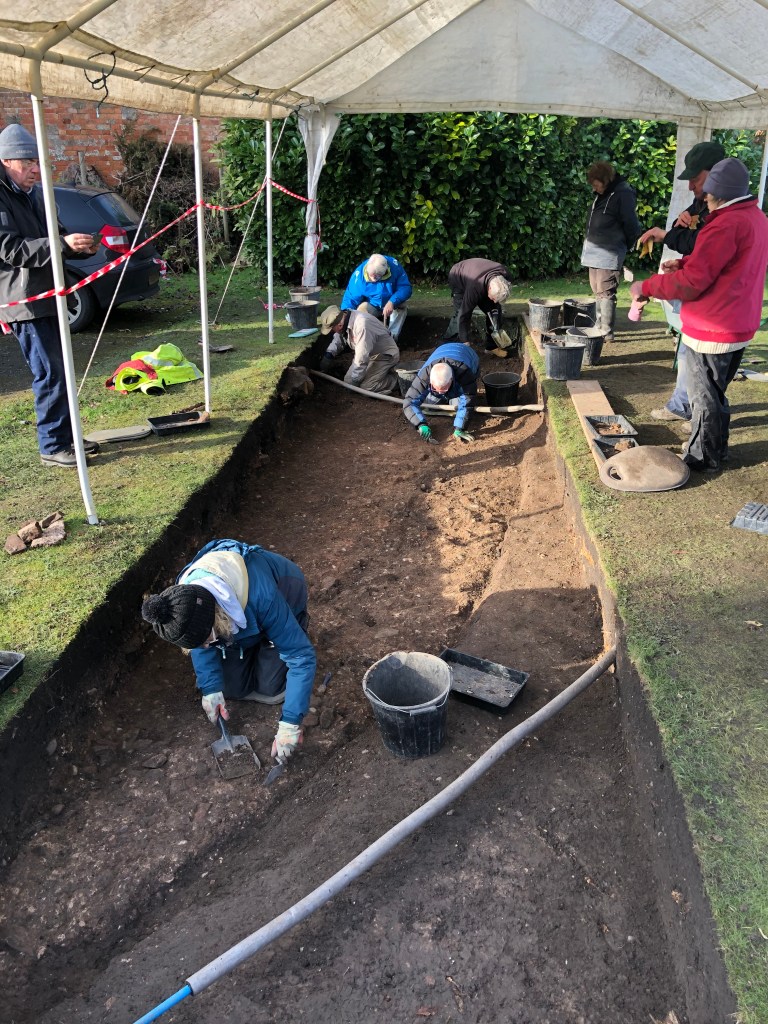 We ended the day with a clean packed-mortar and rubble surface that we then photographed and drew. David is hatching a plan to take a section through this surface next week. Quite alot of small sherds of modern pottery retrieved today; one interesting piece of Staffordshire slip ware, but also tons of stone and ceramic building material. Someone obviously went to alot of trouble to lay this deep feature, but what for?