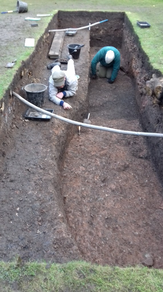 We nearly got off to a flying start as the wind threatened to fly our marquee off somewhere, but better weather has enabled us to get on with the dig again. We appear to have hit a layer of redeposited clay and an old drain channel. Is there anything under the clay, or is that it?
