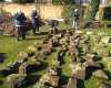 Drawing and recording architectural stonework found in a garden, much of it medieval