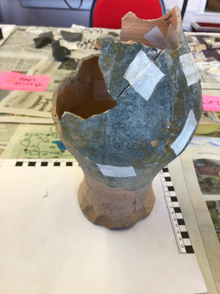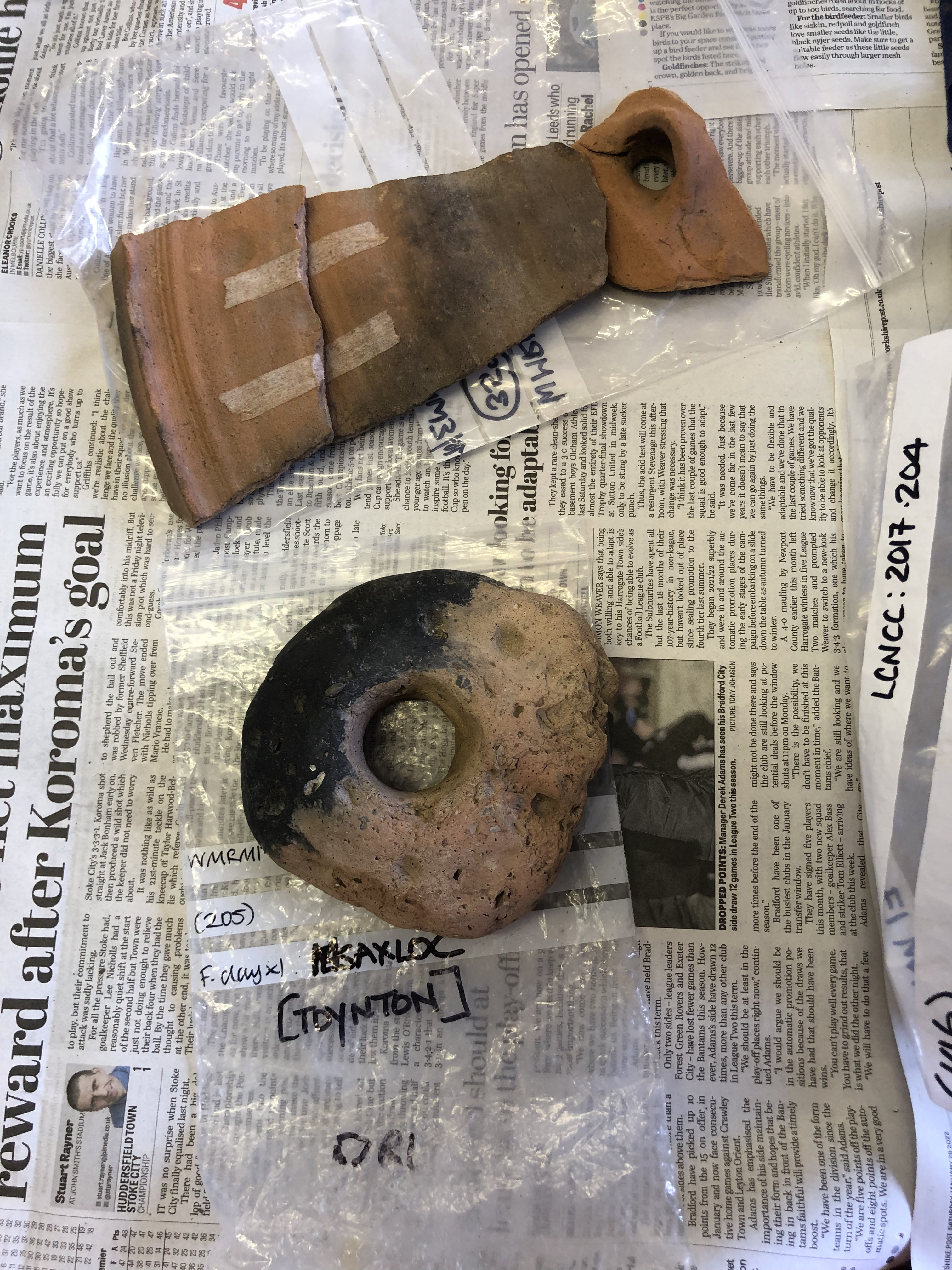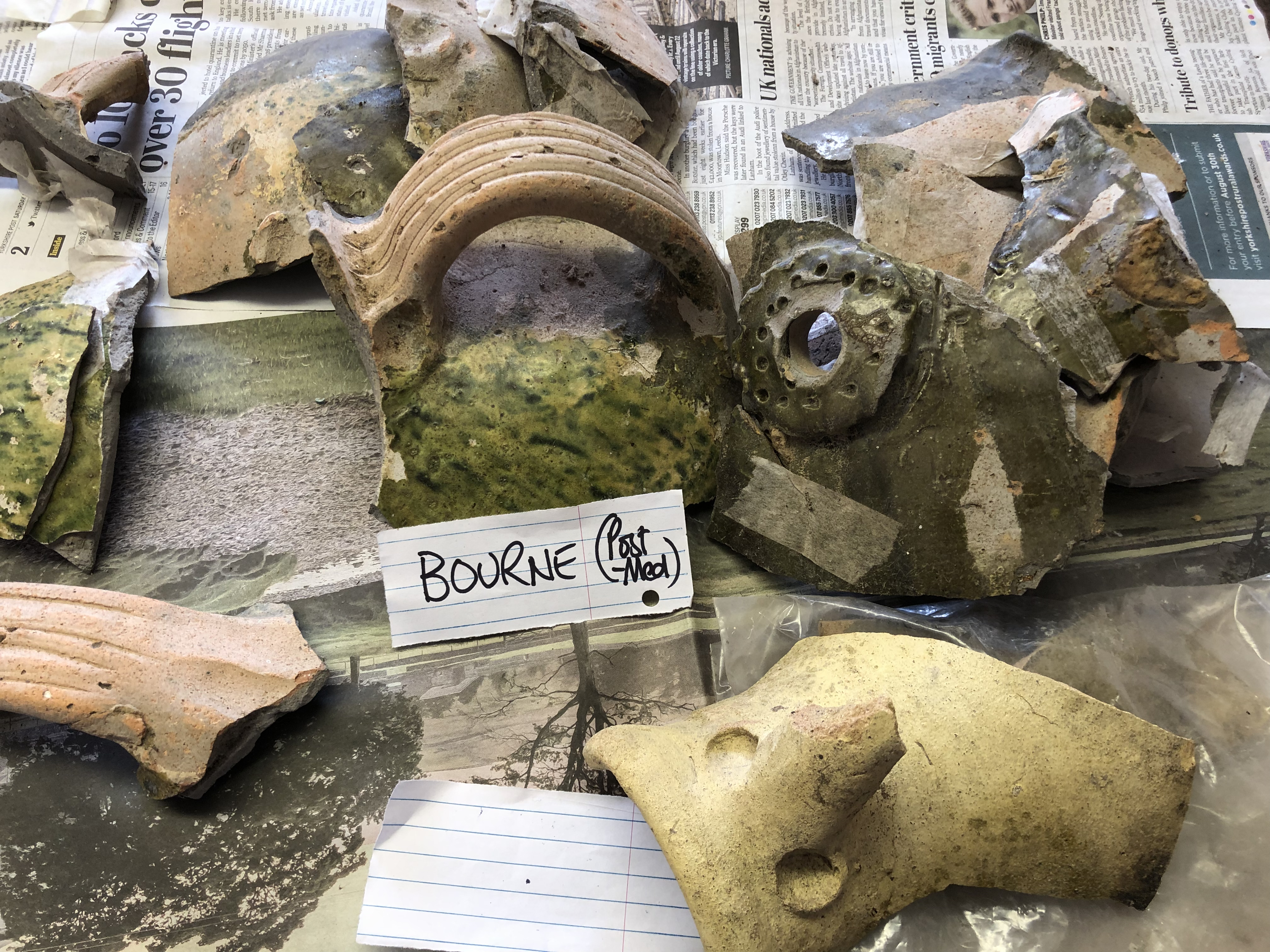 A small group of us have been working with archaeological ceramics expert Jane Young to record and identify the Medieval fabrics we have been finding. We visited Jane’s workshop recently and saw some wonderful finds. A few examples belwo include Toynton Ware (spindle whorl) Potterhanworth jar, Bourne Ware, Midlands Purple, and on the top left Thetford ware from L9th – mid 12th.